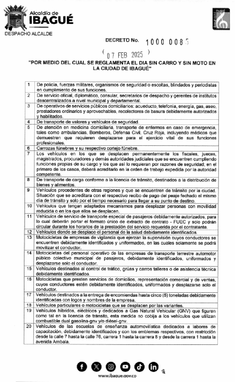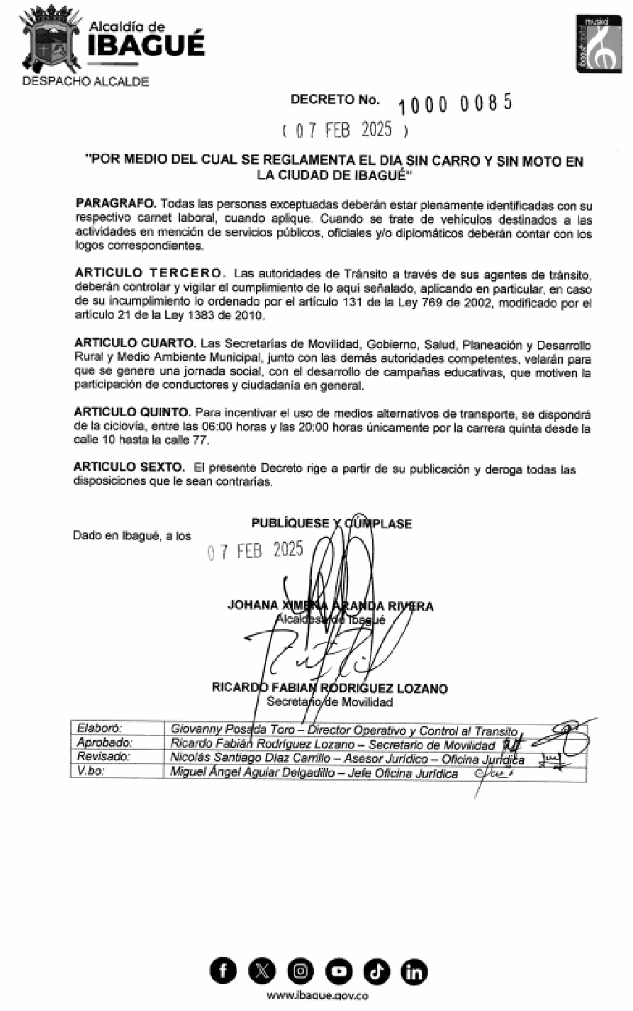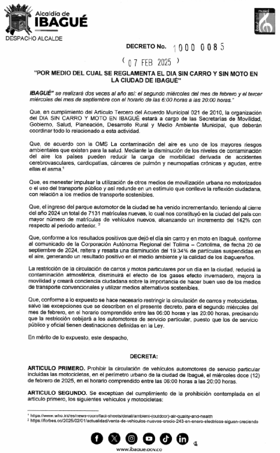 Este miércoles 12 de febrero de 2025, desde las 6:00 de la mañana hasta las 8:00 de la noche, se llevará a cabo el primer Día sin Carro y sin Moto en la capital tolimense.