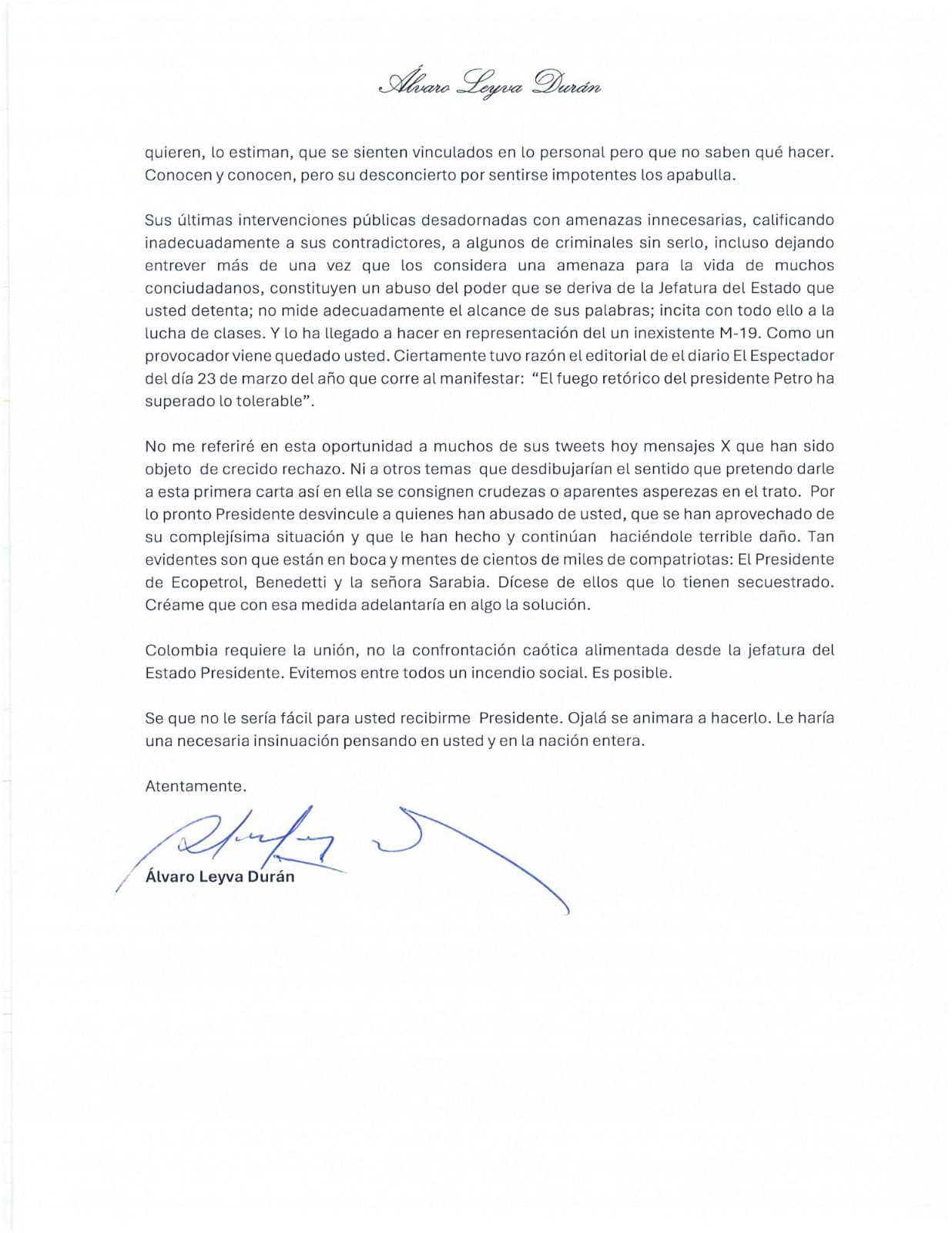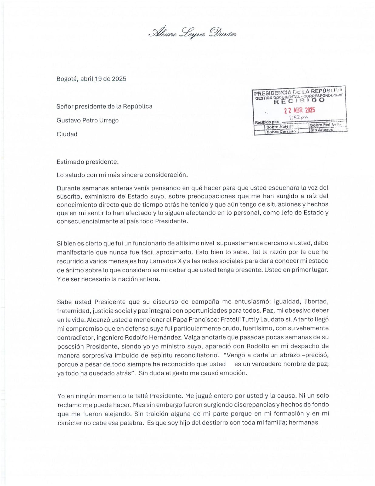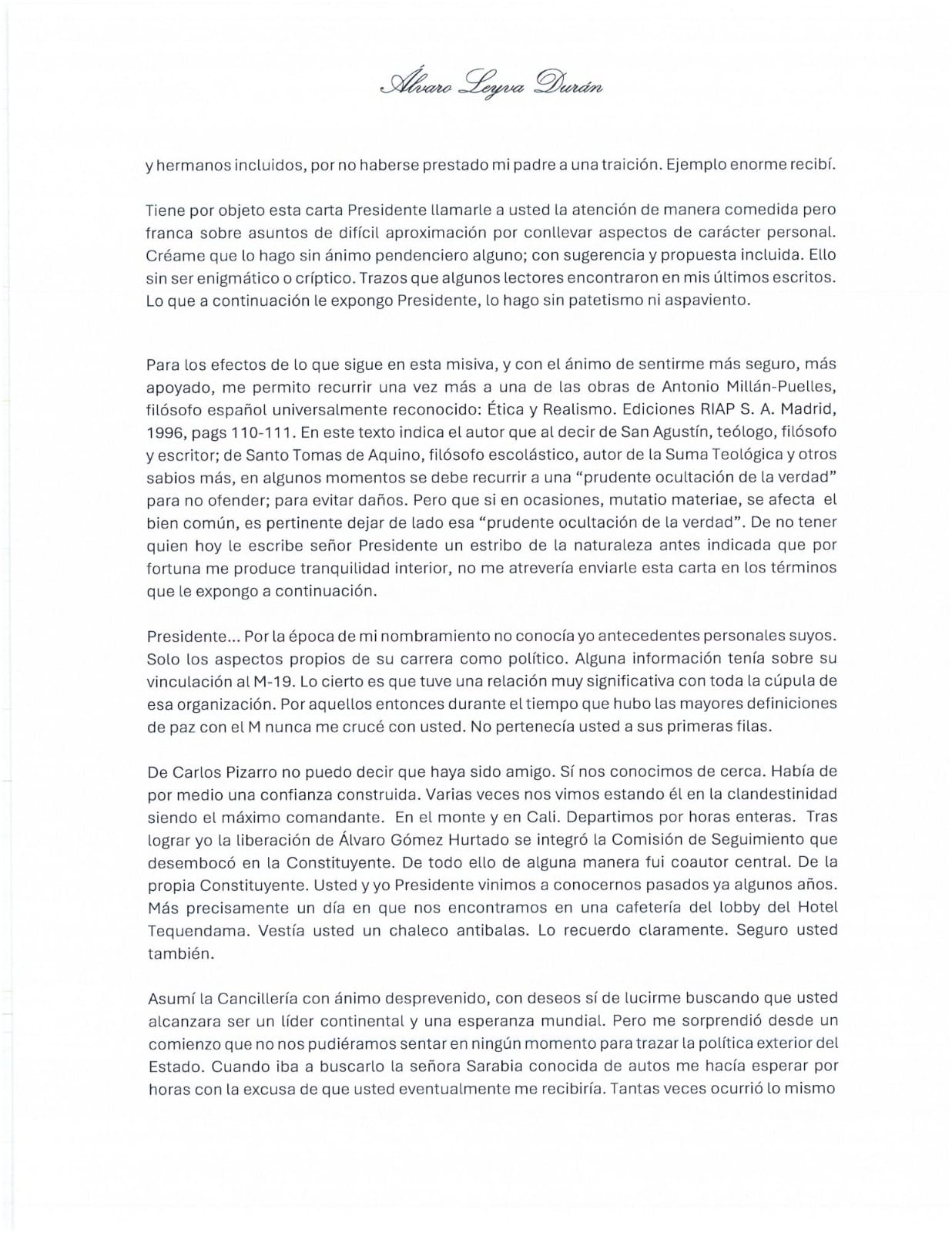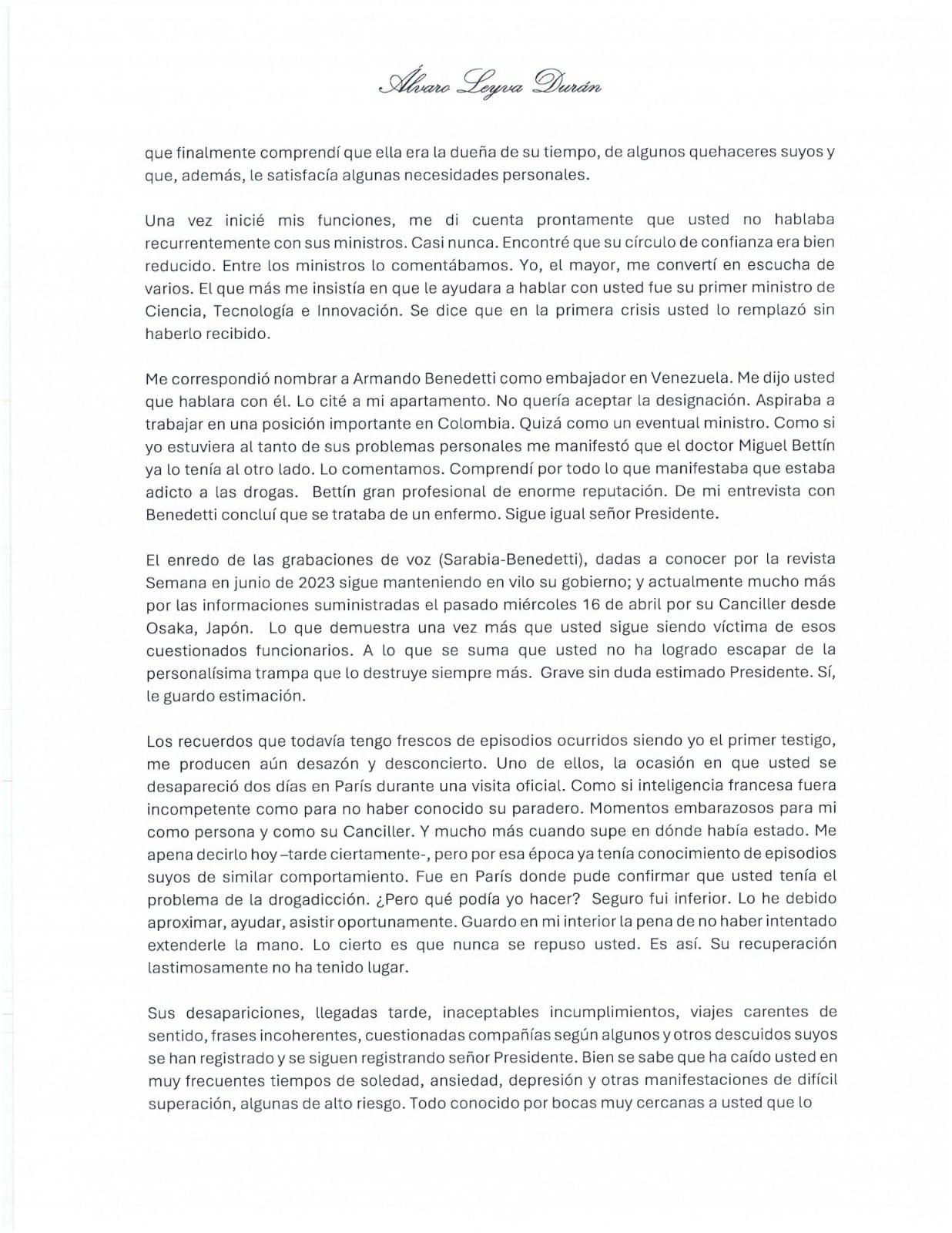 La carta, de cuatro páginas, hace referencia a hechos que, según el mismo Leyva, ocurrieron durante su cargo como canciller de Colombia nombrado por Petro.