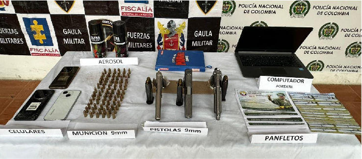 En el operativo se incautaron armas, municiones, proveedores, panfletos extorsivos del Frente Gerónimo Galeano, un computador portátil, teléfonos celulares y una agenda.